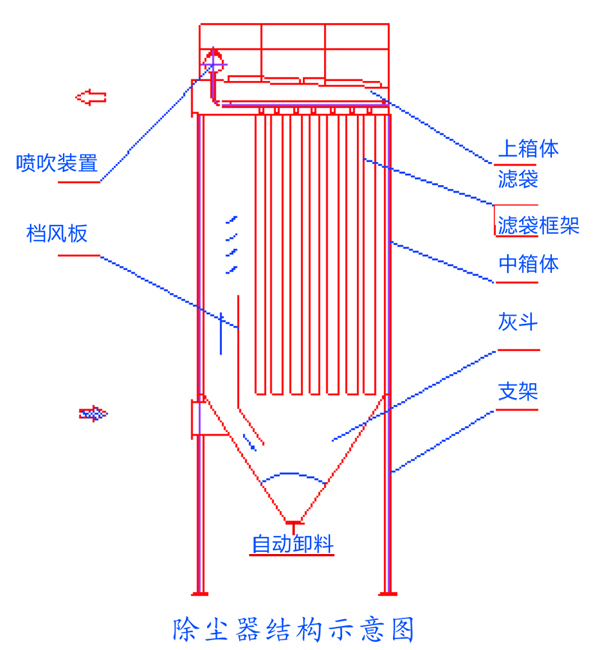 含氣體由灰斗上部進(jìn)風(fēng)口進(jìn)入后,在擋風(fēng)板的作用下,氣流向上流動(dòng),流速降低,部分大顆粒粉塵由于慣性力的作用被分離出來(lái)落入灰斗。含塵氣體進(jìn)入中箱體經(jīng)濾袋的過(guò)濾口進(jìn)入上箱體,由出風(fēng)口排出。